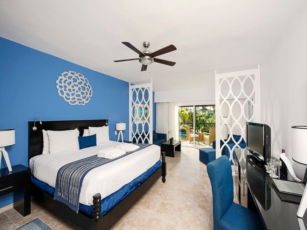 Las exclusivas habitaciones del Ocean Blue & Sand están equipadas con todas las comodidades que pueda necesitar para una estancia cómoda, que incluye un televisor de pantalla plana con canales internacionales, minibar gratuito reabastecido diariamente con refrescos, cerveza y agua, cafetera eléctrica, caja fuerte de cortesía en la habitación, aire acondicionado y ventilador de techo, plancha y tabla de planchar, baño totalmente equipado con secador de pelo y espejo de aumento y servicio de habitaciones de 11 am a 11 pm.